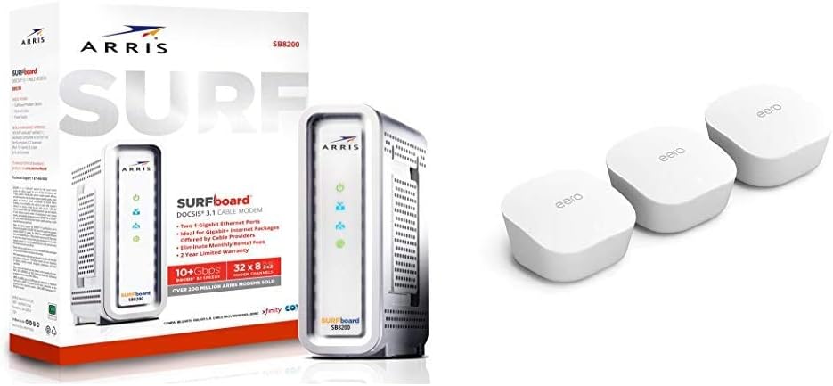 Amazon Com Arris Surfboard Sb8200 Docsis 3 1 Gigabit Cable Modem Approved For Cox Xfinity Spectrum Others Amazon Eero Mesh Wifi System Router Replacement For Whole Home Coverage 3 Pack Computers Accessories